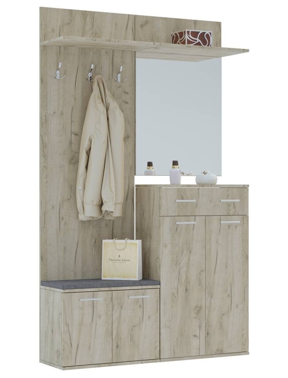 Předsíňová stěna vyrobená z kvalitní laminátové desky ( zadní panel HDF ) v barevném provedení dub kraft šedý. Sestava se skládá ( š/v/h ) – panel s věšákem a komodou ( 60 × 200 × 30 cm ) a panel se zrcadlem a botníkem se zásuvkou ( 60 × 200 × 30 ). Další rozměry viz perokresba. Sedací polštářek je v ceně (barevné provedení polštářku se od obrázku může lišit). Dodáváme v demontovaném stavu.CASA 83001