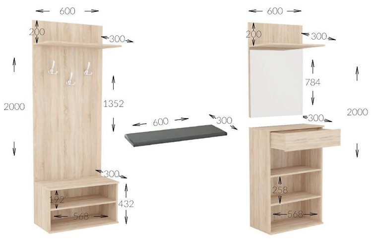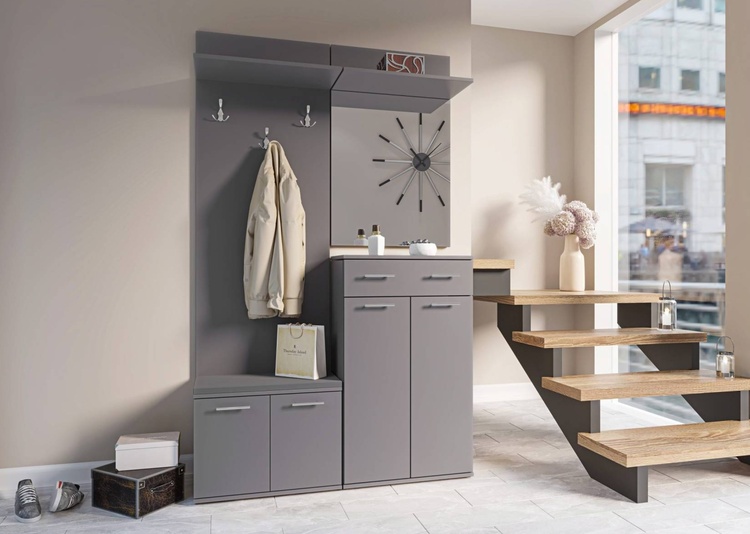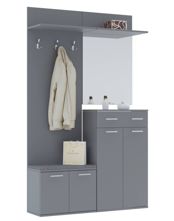 Předsíňová stěna vyrobená z kvalitní laminátové desky ( zadní panel HDF ) v barevném provedení grafit šedý. Sestava se skládá ( š/v/h ) – panel s věšákem a komodou ( 60 × 200 × 30 cm ) a panel se zrcadlem a botníkem se zásuvkou ( 60 × 200 × 30 ). Další rozměry viz perokresba. Sedací polštářek... více informací o zboží