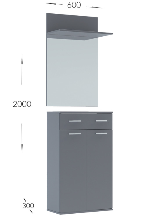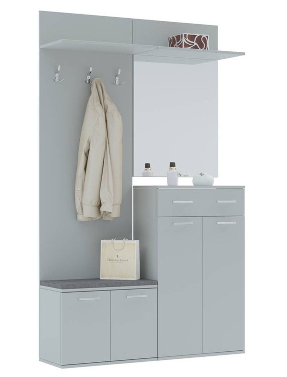 Předsíňová stěna vyrobená z kvalitní laminátové desky ( zadní panel HDF ) v barevném provedení šedá činčila. Sestava se skládá ( š/v/h ) – panel s věšákem a komodou ( 60 × 200 × 30 cm ) a panel se zrcadlem a botníkem se zásuvkou ( 60 × 200 × 30 ). Další rozměry viz perokresba. Sedací polštářek... více informací o zboží
