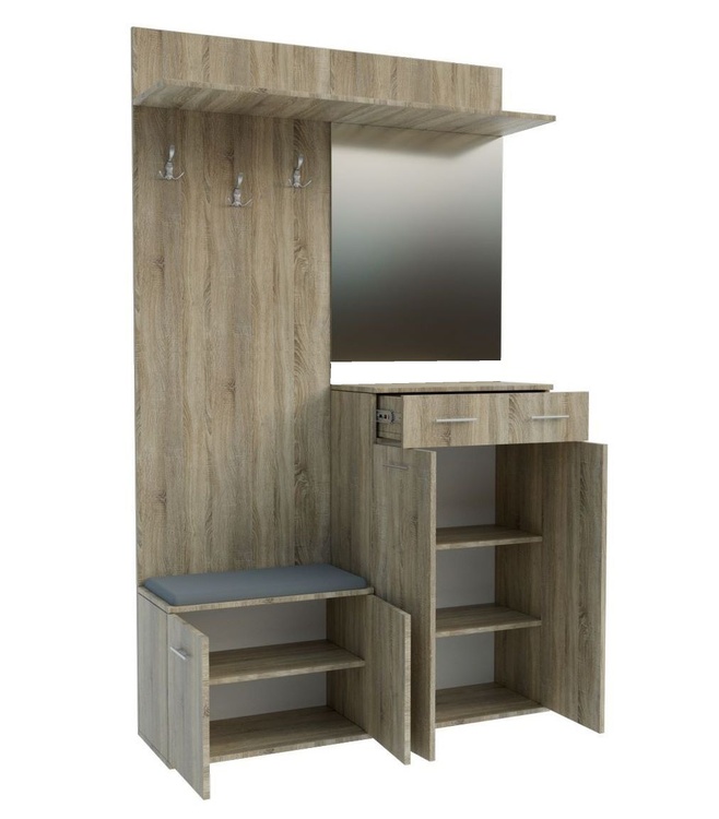 Předsíňová stěna vyrobená z kvalitní laminátové desky ( zadní panel HDF ) v barevném provedení šedá činčila. Sestava se skládá ( š/v/h ) – panel s věšákem a komodou ( 60 × 200 × 30 cm ) a panel se zrcadlem a botníkem se zásuvkou ( 60 × 200 × 30 ). Další rozměry viz perokresba. Sedací polštářek je v ceně (barevné provedení polštářku se od obrázku může lišit). Dodáváme v demontovaném stavu.CASA 83001