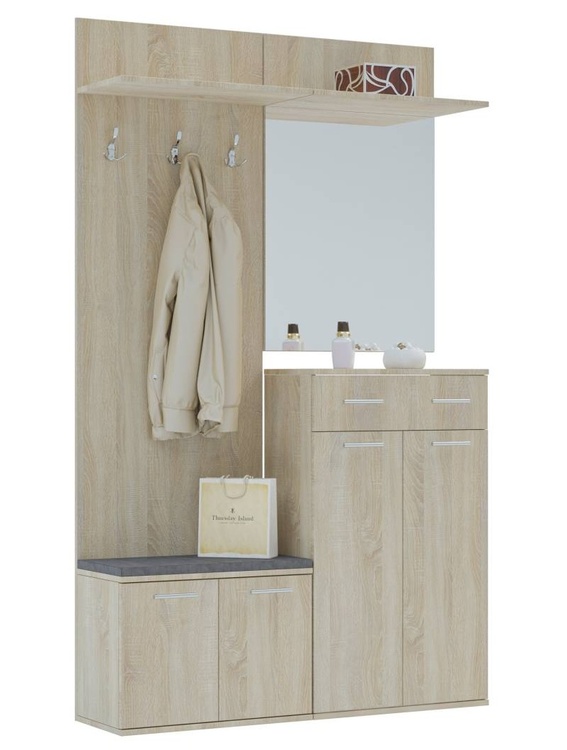 Předsíňová stěna vyrobená z kvalitní laminátové desky ( zadní panel HDF ). Korpus i dvířka jsou v barevném provedení dub sonoma. Sestava se skládá ( š/v/h ) – panel s věšákem a komodou ( 60 × 200 × 30 cm ) a panel se zrcadlem a botníkem se zásuvkou ( 60 × 200 × 30 ). Další rozměry viz perokresba. Sedací polštářek je v ceně (barevné provedení polštářku se od obrázku může lišit). Dodáváme v demontovaném stavu.CASA 83001