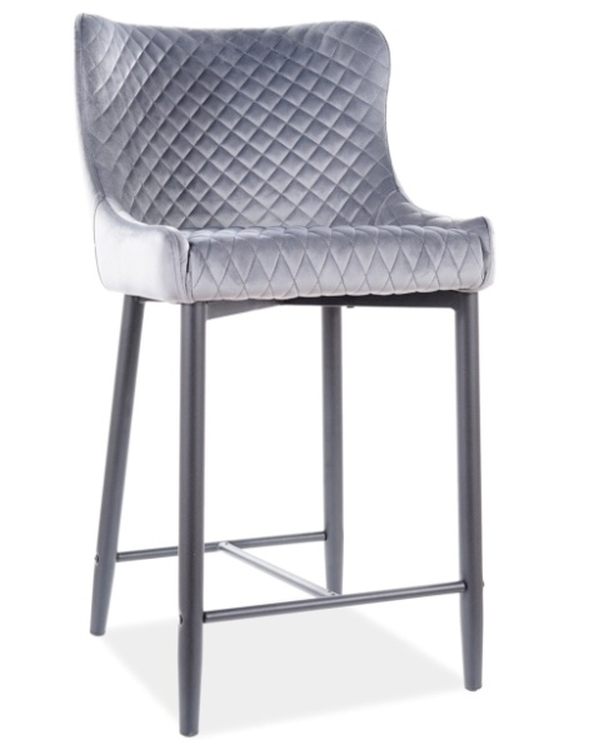 Elegantní barová židle – křeslo v moderním pojetí. Zajímavý vzhled vyzdvihují jemné tvary a dokonalé detaily. Konstrukce je z kovu v černé barvě, čalounění je z potahové látky Bluvel aksamit v šedé barvě. Celková výška židle je 88 cm, výška sedáku je 60 cm. Dodáváme v demontovaném stavu.CASA... více informací o zboží