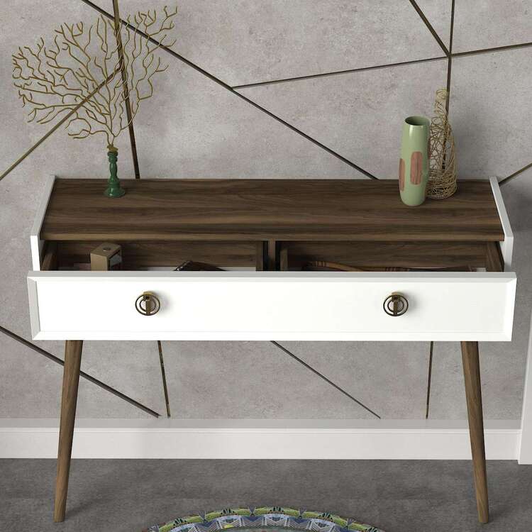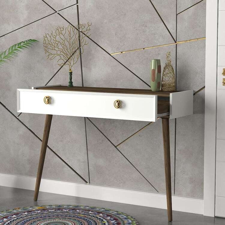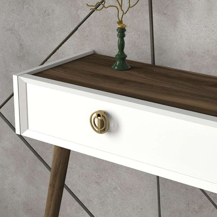 Konzolový stolek se vyznačuje svou elegantní kombinací bílé barvy a ořechového dekoru, což přidává vašemu interiéru moderní a čistý vzhled. Praktická zásuvka poskytuje dostatek prostoru pro uložení vašich drobností, zatímco obdélníkový tvar stolu nabízí dostatek místa pro vystavení dekorací, knih nebo dalších předmětů.