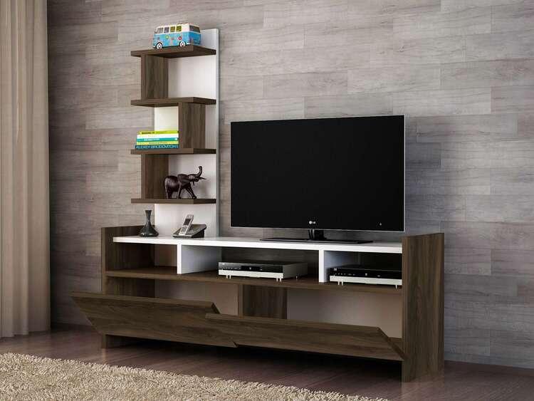 TV stolek je ideální volbou pro ty, kteří hledají moderní a funkční nábytek s elegantním vzhledem. Jeho kombinace bílé a ořechové barvy a minimalistický design přinášejí do vašeho domova svěžest a moderní styl, zatímco poskytují dostatek úložného prostoru pro všechny vaše potřeby.