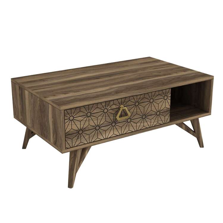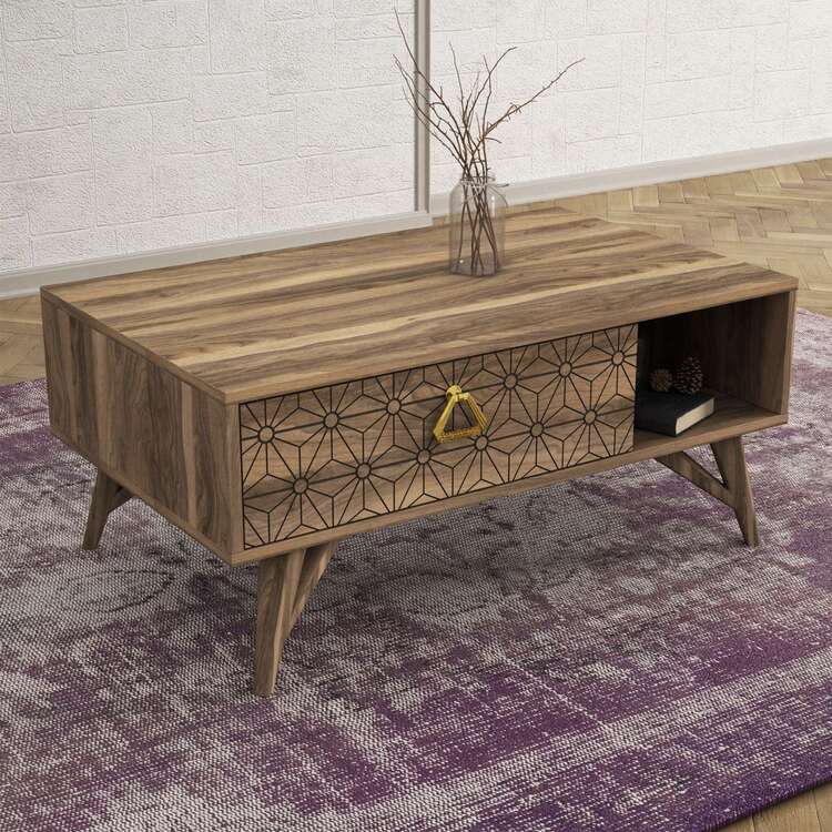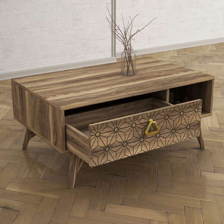 Stolek nabízí prostornou plochu pro vaše kávové šálky, knihy nebo dekorace. Díky jedné zásuvce a odkládací polici poskytuje dostatek úložného prostoru pro vaše potřeby, což udržuje váš obývací pokoj uspořádaný a elegantní.