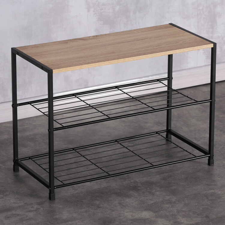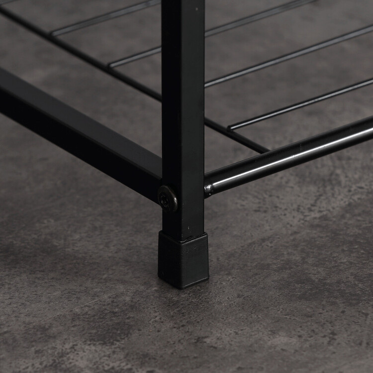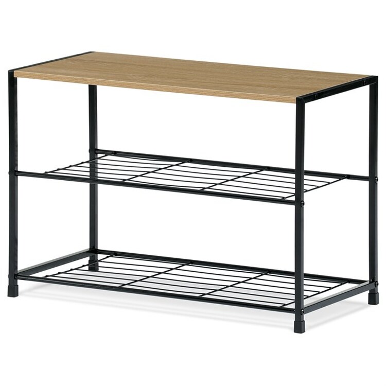 Botník s konstrukcí a odkládacími plochami z lehkého kovu v černé barvě. Půda je vyrobena z MDF desky s povrchovou úpravou 3D folie v odstínu dub sonoma.