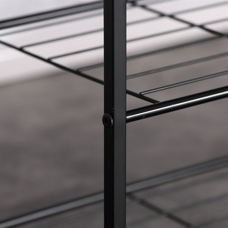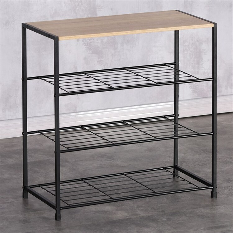 Botník s konstrukcí a odkládacími plochami z lehkého kovu v černé barvě. Půda je vyrobena z MDF desky s povrchovou úpravou 3D folie v odstínu dub sonoma.