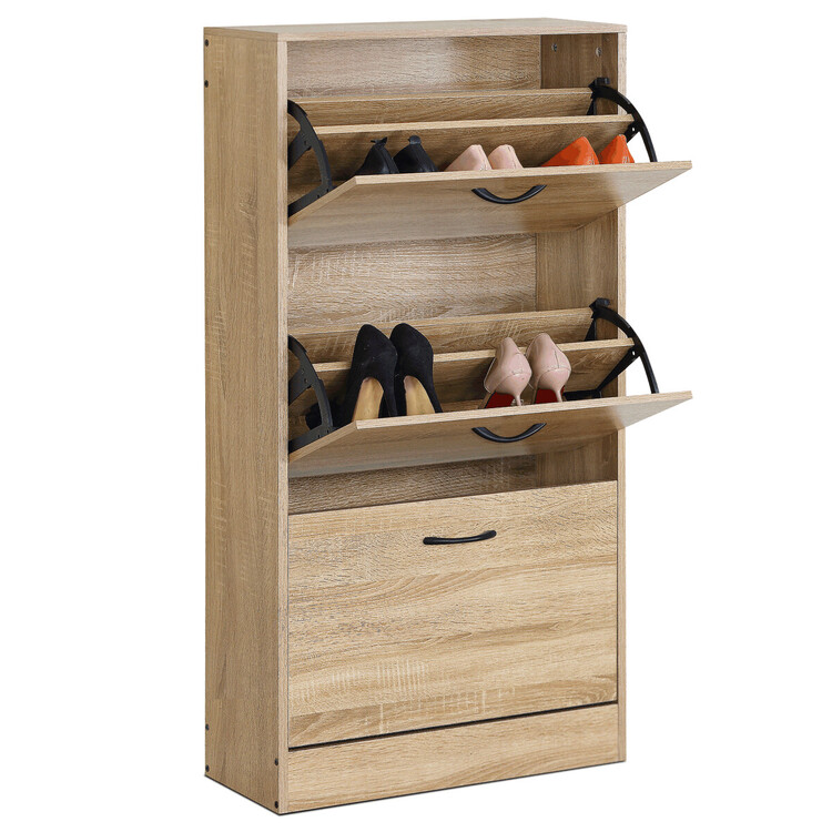 Botník s třemi přihrádkami v dekoru dub je vyroben z MDF desek s povrchovou úpravou, která napodobuje přirozenou strukturu dřeva. Každá přihrádka je opatřena černou kovovou úchytkou pro snadné otevírání a zavírání. Kompaktní rozměry umožňují umístění do předsíní i menších prostor, kde poskytuje praktické řešení pro uskladnění obuvi. Stabilní provedení a kvalitní materiál zajišťují dlouhou životnost a snadnou údržbu. Botník je vhodný pro organizaci domácího prostoru s důrazem na jednoduchý a přírodní vzhled.