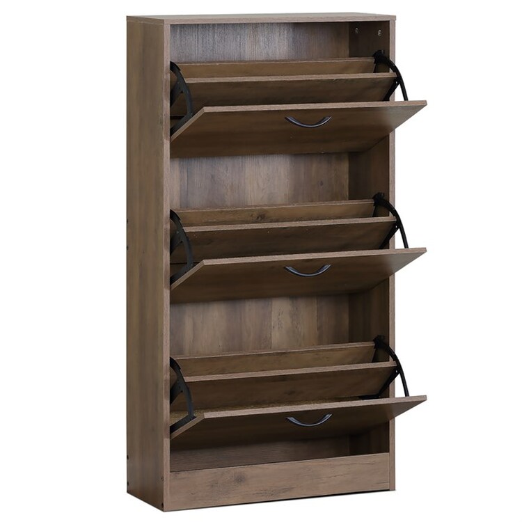 Botník s třemi přihrádkami v dekoru jilmového dřeva je vyroben z MDF desek s povrchovou úpravou, která napodobuje přirozenou strukturu dřeva. Každá přihrádka nabízí dostatek prostoru pro uskladnění obuvi a je opatřena černými kovovými úchytkami pro snadné otevírání. Kompaktní rozměry botníku... více informací o zboží
