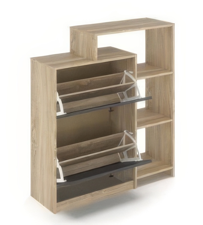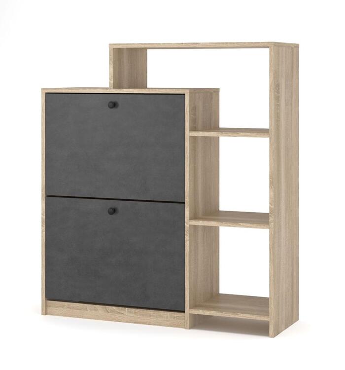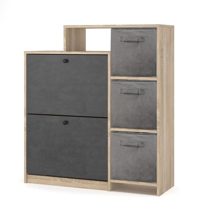 Botník se dvěma výklopnými dvířky a regálem, vyrobený z desky LTD v barveném provedení dub sonoma. Výklopná dvířka jsou v barvě šedá. Součástí regálu jsou také 3 ks látkové organizéry v šedé barvě. Dodáváme v demontovaném stavu.CASA 97041