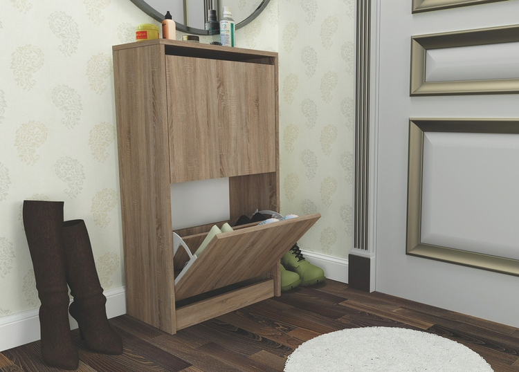 Dvoudveřový výklopný botník v moderním provedení. Korpus i dvířka jsou z kvalitního LTD v barvě dub lanýž. Dodáváme v demontovaném stavu.CASA 83030