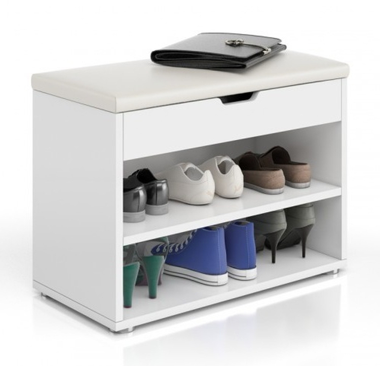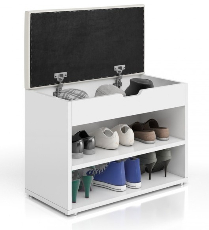 Botník v moderním provedení. Korpus z lamina je v barvě matná bílá, přední strana z MDF také v bílém matu. Lamino i MDF jsou odolné vůči vysokým teplotám, poškrábání a nárazům. Botník obsahuje praktický úložný prostor, sedák je čalouněný ekokůží. Dodáváme v demontovaném stavu.CASA 98222