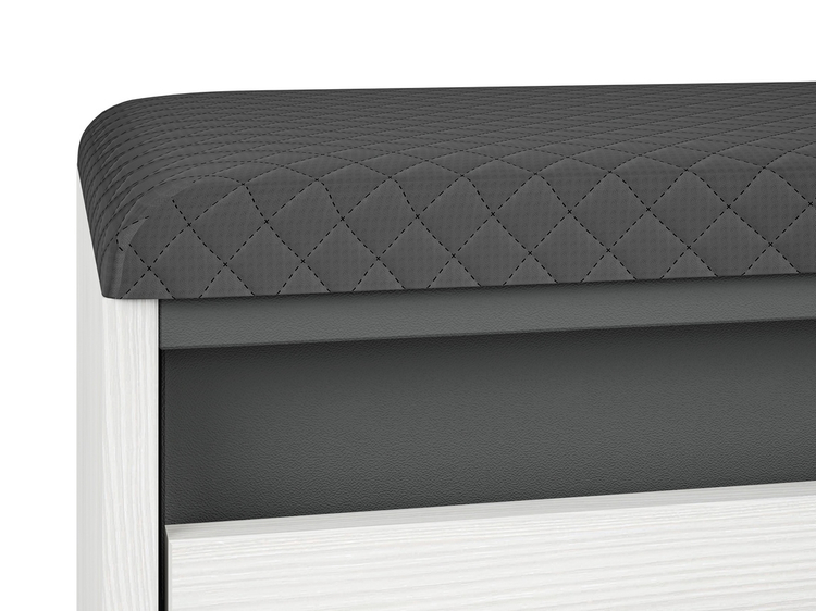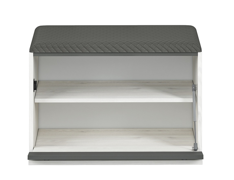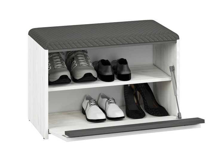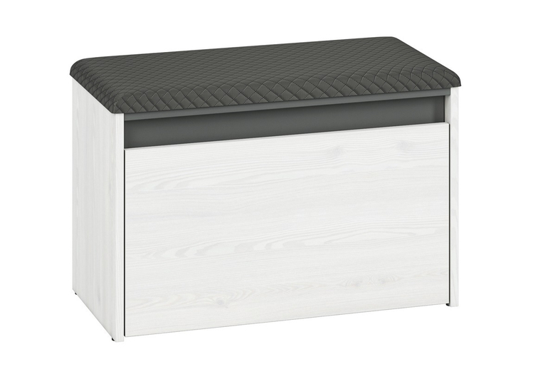 Botník s výklopnými dvířky a polstrovaným sedákem je vyroben z desky LTD v kombinaci barev borovice sněžná/antracit. Dodáváme v demontovaném stavu.CASA 56015