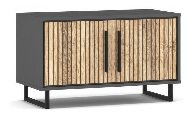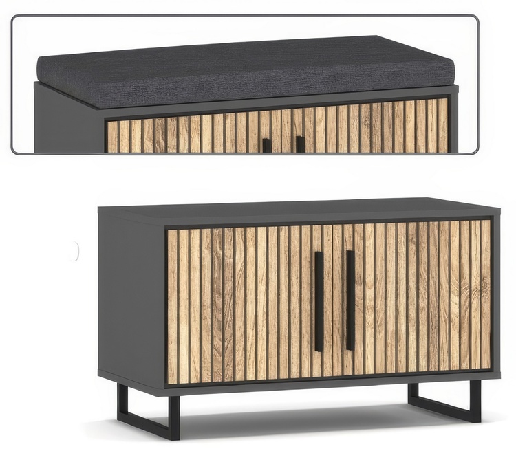 Botník dvoudveřový v industriálním stylu je vyroben z LTD desky, korpus je v barvě šedé, přední část dvířek je doplněna lištami z přírodního dubového dřeva. Nohy jsou kovové černé. Podsedák je součástí botníku. Nábytek disponuje teleskopickými pojezdy a systémem samodovíracích závěsů. Nabídka... více informací o zboží