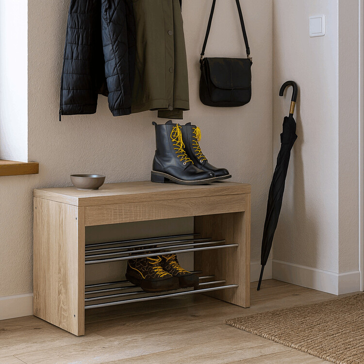 Praktický botník s dvěma chromovanými kovovými policemi nabízí dostatek prostoru pro uložení obuvi v předsíni či chodbě. Tělo botníku je vyrobeno z MDF desek s dekorativním 3D povrchem v odstínu dub sonoma, který přináší přírodní vzhled a snadnou údržbu. Stabilní desky zajišťují pevnost a odolnost, zatímco kovové police umožňují větrání a rychlé schnutí obuvi. Kompaktní rozměry botníku umožňují jeho umístění i do menších prostor. Botník je ideální volbou pro organizaci obuvi s důrazem na funkčnost a decentní design.