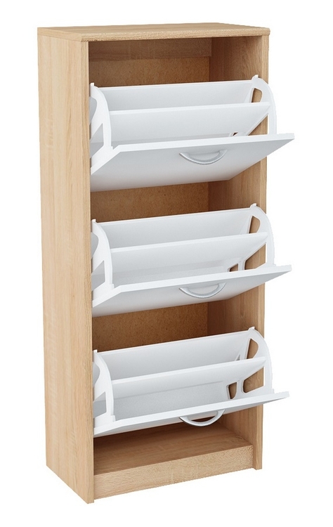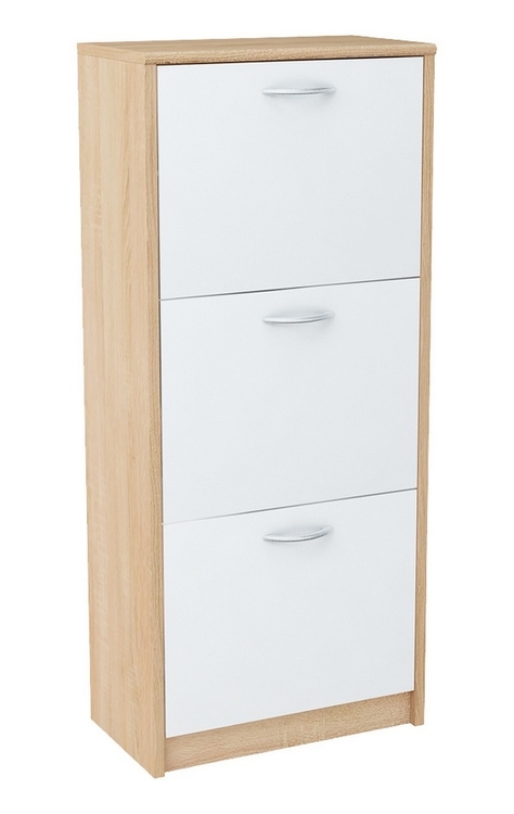 Třídveřový výklopný botník v moderním provedení. Korpus je v barvě dub sonoma a dvířka jsou v barvě bílá mat. Korpus i dvířka jsou z kvalitního LTD. Lamino je odolné vůči vysokým teplotám, poškrábání a nárazům, hraněné ABS páskou. Jasně viditelná struktura dřeva. Pojezdy v zásuvce jsou kovové s plastovými kolečky. Dodáváme v demontovaném stavu.CASA 53018