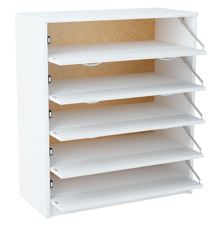 Výklopný botník s 5 přihrádkami v moderním provedení. Korpus i dvířka jsou z kvalitního LTD (16 mm) v barvě matná bílá. Lamino je odolné vůči vysokým teplotám, poškrábání a nárazům, hraněné ABS páskou. Jasně viditelná struktura dřeva. Dodáváme v demontovaném stavu.CASA 53025