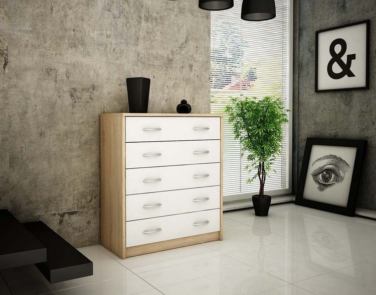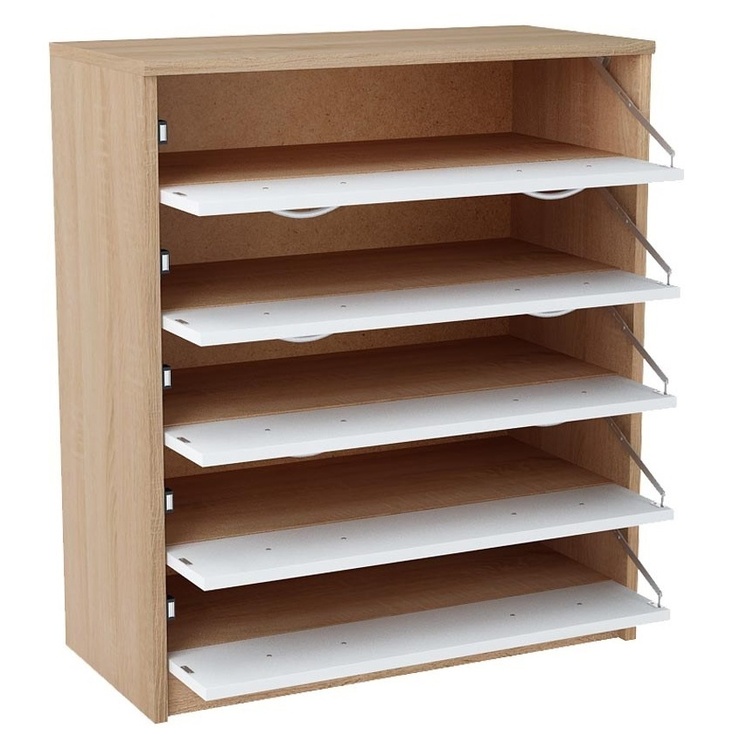 Výklopný botník s 5 přihrádkami v moderním provedení. Korpus i dvířka jsou z kvalitního LTD (16 mm) v barvě dub sonoma/bílá mat. Lamino je odolné vůči vysokým teplotám, poškrábání a nárazům, hraněné ABS páskou. Jasně viditelná struktura dřeva. Dodáváme v demontovaném stavu.CASA 53025
