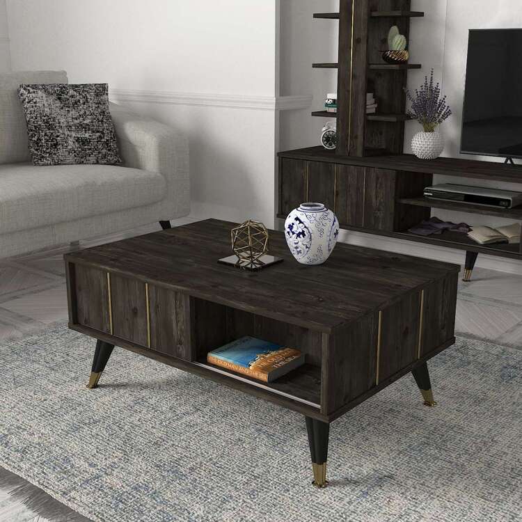 Konferenční stolek je ideální volbou pro ty, kteří hledají moderní a funkční nábytek. Jeho tmavě hnědá barva a minimalistický design přinášejí do vašeho domova svěžest a moderní styl, zatímco poskytují dostatek úložného prostoru pro všechny vaše potřeby.