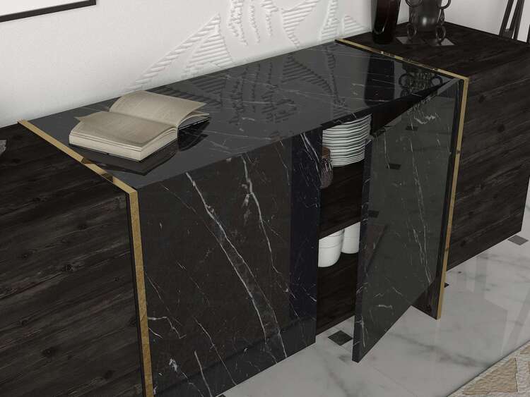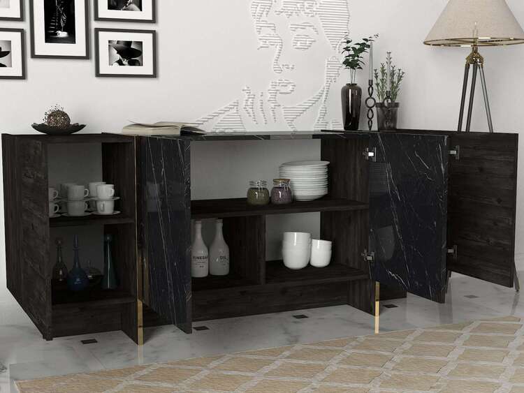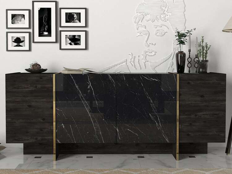 Komoda je vyrobena z kvalitního LTD materiálu s tloušťkou 18 mm, což zajišťuje její pevnost a dlouhou životnost. Elegantní kombinace tmavě hnědé barvy a mramorového dekoru dodává komodě luxusní a sofistikovaný vzhled, který se hodí do jakéhokoliv interiéru. Komoda je vybavena čtyřmi dvířky, které poskytují dostatek úložného prostoru pro vaše potřeby.