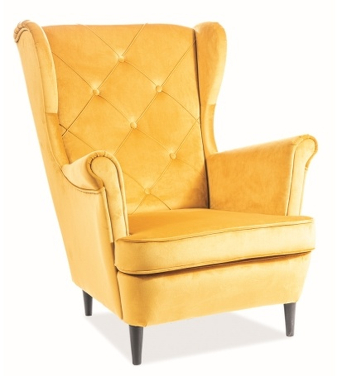 Pohodlné čalouněné křeslo v elegantním stylu bude ozdobou každého interiéru. Nožky jsou ze dřeva v barvě wenge, čalounění je z látky velvet ve žluté curry barvě (Bluvel 68). Pohodlí a elegance ve Vašem obýváku, dětském pokoji či kanceláři.CASA 11017