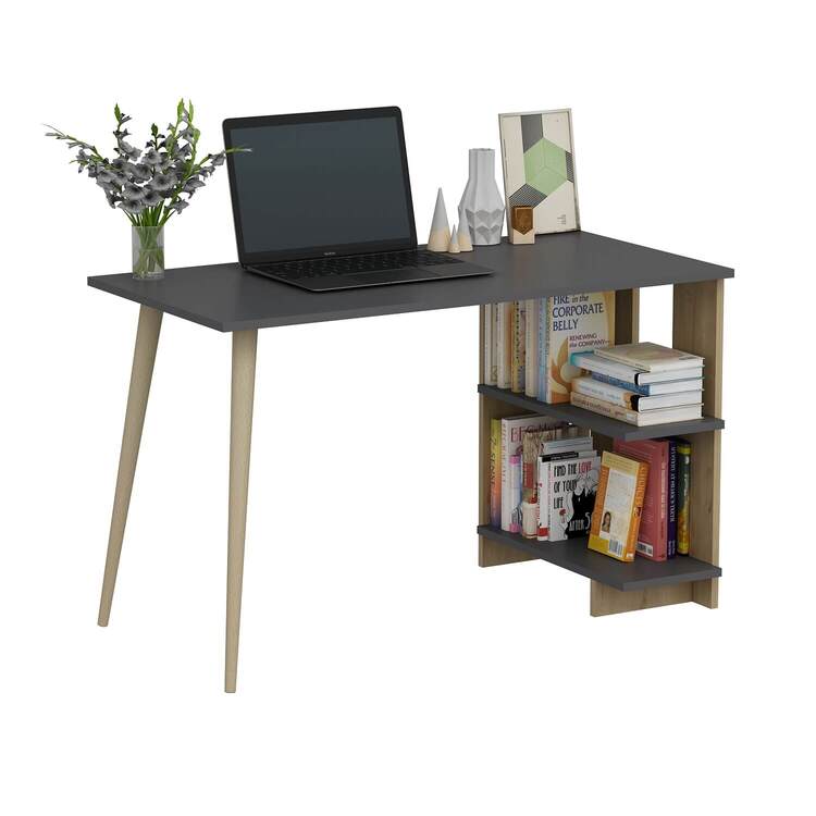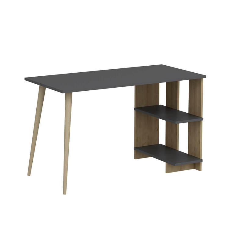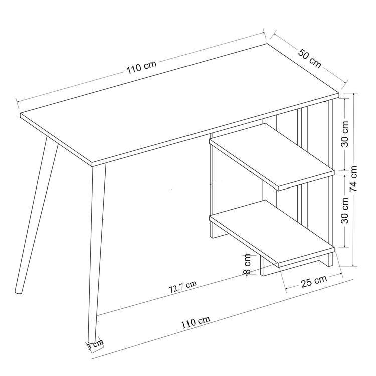S rozměry 74 × 110 × 50 cm poskytuje dostatek prostoru pro pohodlnou práci či studium. Regálek integrovaný do konstrukce nabízí praktické úložné místo pro dokumenty, knihy nebo školní pomůcky.