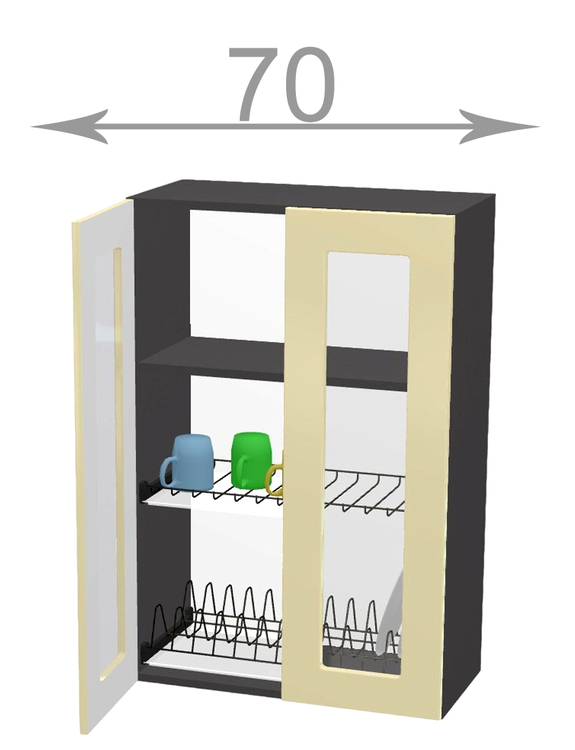 Kuchyňský sektor Capri, horní vysoká vitrína s odkapávačem, šířka 70 cm, 2 dvířka, korpus grafit, dvířka dub tabaco. Vyšší vitrína s odkapávačem na nádobí do zástavby horních skříněk 92 cm. Představujeme vám kuchyňský sektor Capri – nejlevnější kuchyni s možností poskládat si vlastní kuchyňskou sestavu ze skříněk dle svých potřeb a prostoru. Kupujte chytře a výhodně! Kuchyňská linka na míru vás nemusí stát majlant. U kuchyně Capri máte na výběr víc jak 10 barev kuchyňských dvířek jak v dřevodekoru, tak v unikolorech. Zvolit si lze i barvu korpusu, takže výsledná kuchyňská linka na míru se bude krásně hodit do vaší kuchyně jak rozměrem tak barvou. Závěsy horních skříněk (v ceně) jsou bez možnosti regulace. V nabídce též regulovatelné závěsy. Výhodou je, že úchyty skříněk jsou součástí dvířek a tudíž jsou v ceně.