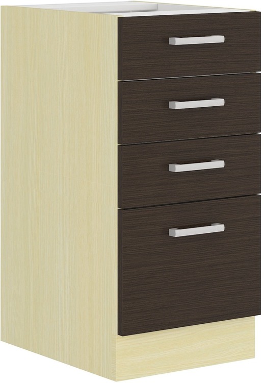 Dolní skříňka se 4 zásuvkami CHAMONIX II vyrobená z kvalitního lamina. Korpus i sokl ( 10 cm ) jsou v barvě dub ferrara a dvířka v barvě dub tmavé legno. Rozměry skříňky – šířka 40 cm, výška 82 cm, hloubka 52 cm ( s pracovní deskou zabere 60 cm ). Vzadu se nechává volný prostor. Pracovní deska není v ceně. Úchyty jsou z plastu. V naší nabídce naleznete další výběr skříněk k sestavení celé kuchyně.CASA 87003