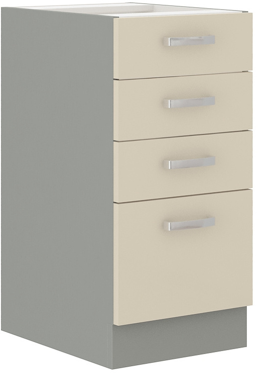 Dolní skříňka se 4 zásuvkami KARMEN vyrobená z kvalitního lamina a MDF. Korpus i sokl ( 10 cm ) jsou v barvě šedá a dvířka v barvě karmen krémová v lesku. Rozměry skříňky – šířka 40 cm, výška 82 cm, hloubka 52 cm ( s pracovní deskou zabere 60 cm ). Vzadu se nechává volný prostor. Pracovní deska není v ceně. Úchyty jsou z kovu. V naší nabídce naleznete další výběr skříněk k sestavení celé kuchyně.CASA 87001