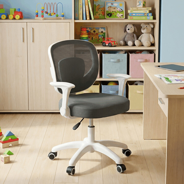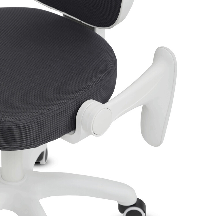 Dětská židle s šedým síťovinovým potahem nabízí prodyšné a pohodlné sezení vhodné pro mladší uživatele. Opěradlo je z lehké a pevné síťoviny, která podporuje cirkulaci vzduchu, zatímco sedák je čalouněný látkou stejné barvy pro příjemný komfort. Bílé plastové nohy s pěti rameny zajišťují stabilitu a jsou vybaveny kolečky určenými pro tvrdé podlahy, což umožňuje snadný pohyb bez poškození povrchu. Odklápěcí područky přispívají k flexibilitě používání a výškově nastavitelný mechanismus umožňuje přizpůsobení výšky sedáku podle potřeby dítěte. Židle je navržena tak, aby kombinovala funkčnost s jednoduchým designem vhodným do dětských pokojů.