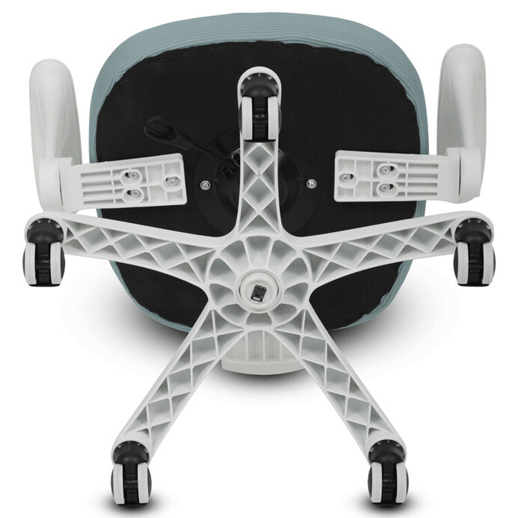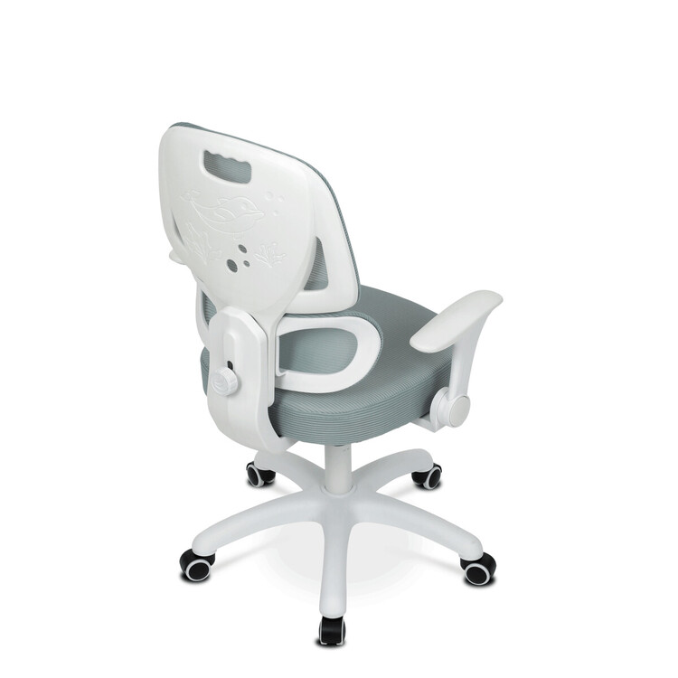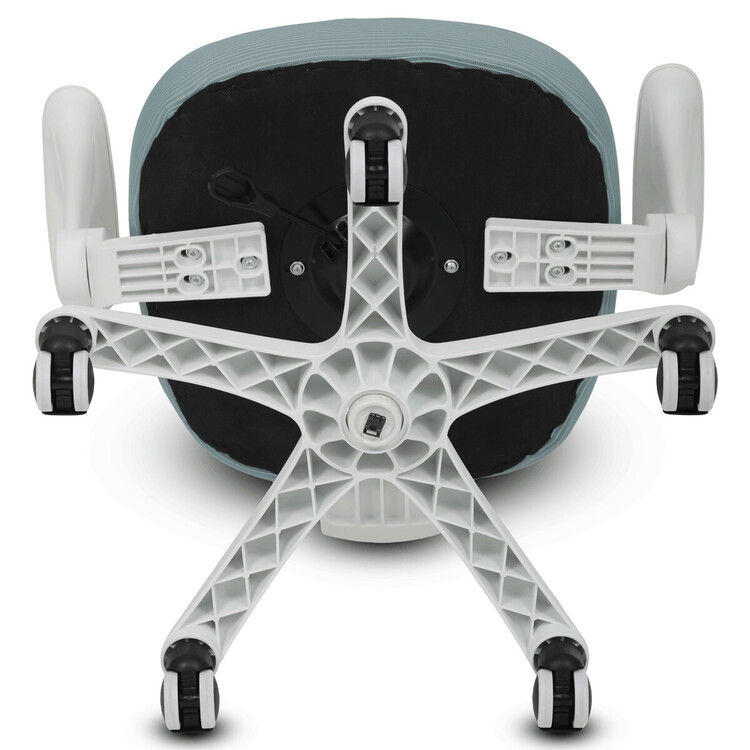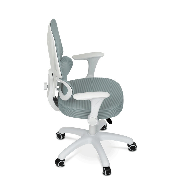 Dětská židle s konstrukcí z bíle plastového kříže a kolečky určenými pro tvrdé podlahy nabízí stabilní a bezpečné sezení. Opěradlo i sedák jsou potaženy zelenou prodyšnou síťovinou, která zajišťuje komfortní cirkulaci vzduchu během používání. Výškově nastavitelný opěrák a sedák umožňují přizpůsobení židle aktuálním potřebám dítěte, zatímco odklápěcí područky přispívají k větší flexibilitě a snadnému přístupu ke stolu. Integrovaná bederní opěrka podporuje správné držení těla a přispívá k ergonomii sezení. Díky těmto vlastnostem je židle vhodná pro dlouhodobé používání v dětském pokoji nebo pracovně.