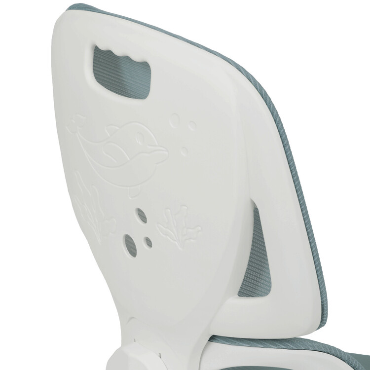 Dětská židle s konstrukcí z bíle plastového kříže a kolečky určenými pro tvrdé podlahy nabízí stabilní a bezpečné sezení. Opěradlo i sedák jsou potaženy zelenou prodyšnou síťovinou, která zajišťuje komfortní cirkulaci vzduchu během používání. Výškově nastavitelný opěrák a sedák umožňují... více informací o zboží