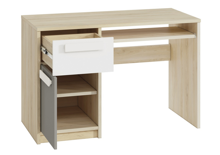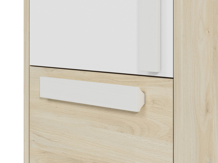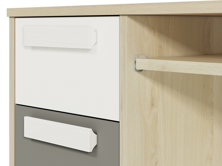Sestava do dětského pokoje v moderním provedení. Korpus je vyroben z kvalitní desky LTD hraněné ABS páskou v barvě buk fjord, dvířka jsou vyrobeny z desky LTD v kombinaci barev buk fjord/bílá/šedá. Sestava se skládá z těchto položek (Š x V x H cm) – šatní skříň (80 × 199 × 55 cm),regál se zásuvkami (55 × 199 × 40 cm) a pracovní stůl (119 × 79 × 55 cm). Úchyty jsou dřevěné bílé. Dodáváme v demontovaném stavu.CASA 56010