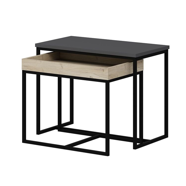 Konferenční stolek je moderní a praktická sada dvou stolků, které se dokonale hodí do každého obývacího pokoje. Tato sestava zahrnuje větší stolek s rozměry 65×35×50 cm a menší stolek, jehož horní deska je navíc vybavena praktickými okraji. Antracitová barva dodává stolku elegantní vzhled, který podtrhne moderní interiér.