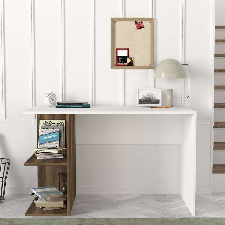 Písací stůl je vyroben z kvalitního LTD materiálu s tloušťkou 18 mm, což zajišťuje jeho pevnost a dlouhou životnost. Elegantní kombinace bílé a ořechové barvy dodává stolu moderní a stylový vzhled, který se hodí do jakéhokoliv interiéru. Stůl je vybaven praktickým regálkem, který poskytuje dostatek úložného prostoru pro vaše pracovní potřeby a pomůcky.