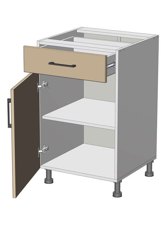 Dolní skříňka se šuplíkem, šířka 50 cm, 1 šuplík, 1 dvířka jasan, grafit korpus. Náleží do kuchyňské sektorové řady Modena. Účelně řešená skříňka s jedním šuplíkem vhodným pro příbory a dvířky pod tímto šuplíkem. Moderní levný kuchyňský sektor Modest je vyroben z odolného LTD. V ceně je příslušné kování. Z jednotlivých skříněk je možno si vyskládat kuchyni na míru dle potřeb. Pracovní deska a soklová lišta jsou na výběr a objednávají se zvlášť. Nožky dolních skříněk mají výšku 10 cm a jsou v ceně skříňky. Nabízíme také nožky 15 cm. Úchytky ke skříňce se objednávají zvlášť. Na výběr je více než 10 typů úchytek, takže lze vybrat dle vašeho vkusu. Dvířka jsou již předvrtána na rozteč 128 mm.