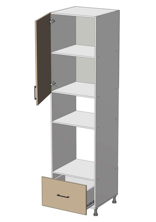 Vysoká potravinová skříň na vestavnou troubu a mikrovlnku v. 234 cm, šířka 60 cm, 1 šuplík, 1 dvířka jasan, grafit korpus. Náleží do kuchyňské sektorové řady Modena. Potravinová skříň o výšce 234 cm, vhodná pokud do kuchyně použijete vysoké horní skříňky 92 cm. Moderní levný kuchyňský sektor Modest je vyroben z odolného LTD. V ceně je příslušné kování. Z jednotlivých skříněk je možno si vyskládat kuchyni na míru dle potřeb. Pracovní deska a soklová lišta jsou na výběr a objednávají se zvlášť. Nožky dolních skříněk mají výšku 10 cm a jsou v ceně skříňky. Nabízíme také nožky 15 cm. Úchytky ke skříňce se objednávají zvlášť. Na výběr je více než 10 typů úchytek, takže lze vybrat dle vašeho vkusu. Dvířka jsou již předvrtána na rozteč 128 mm.