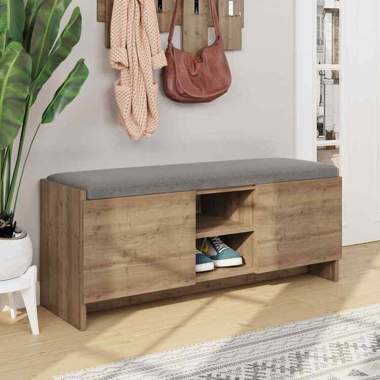 je vyroben z kvalitních materiálů, jako je melamin, VT laminát a látka, což zajišťuje jeho odolnost a dlouhou životnost. Dvířka skrývají úložný prostor pro vaše boty a další příslušenství, zatímco regálek a pohodlná lavice nabízejí dodatečné místo pro uskladnění a komfortní sezení. Je to ideální doplněk pro každou předsíň hledající spojení estetiky a funkce.