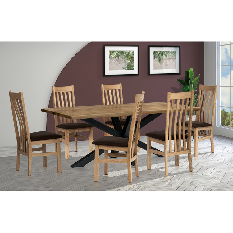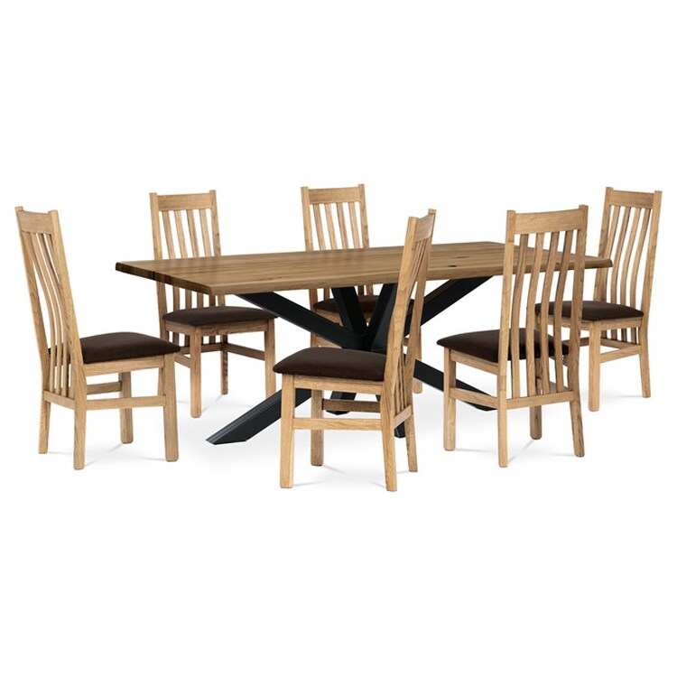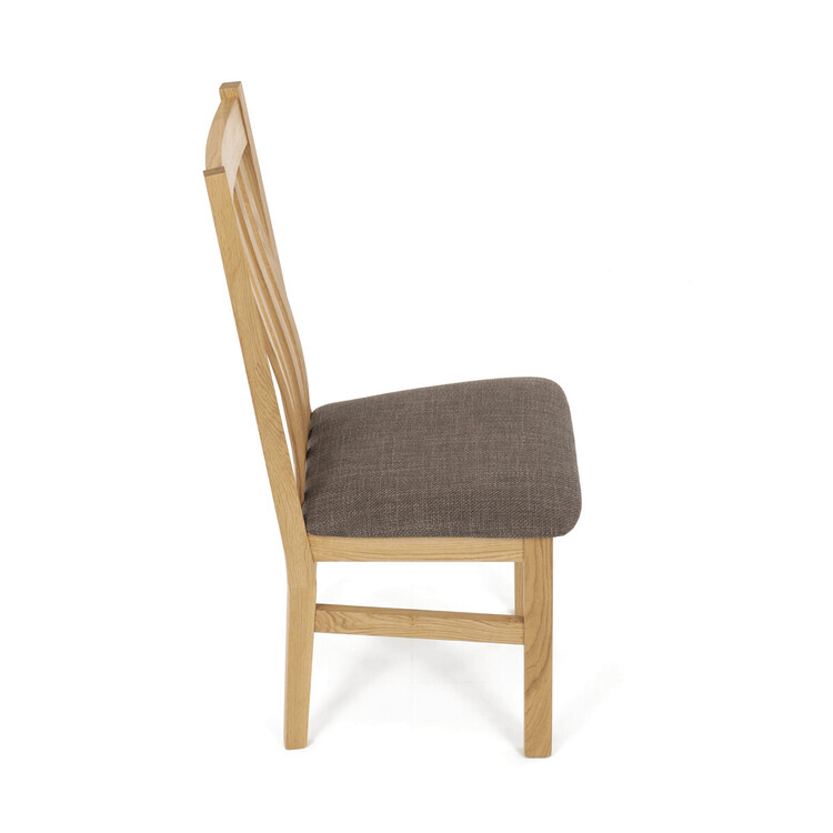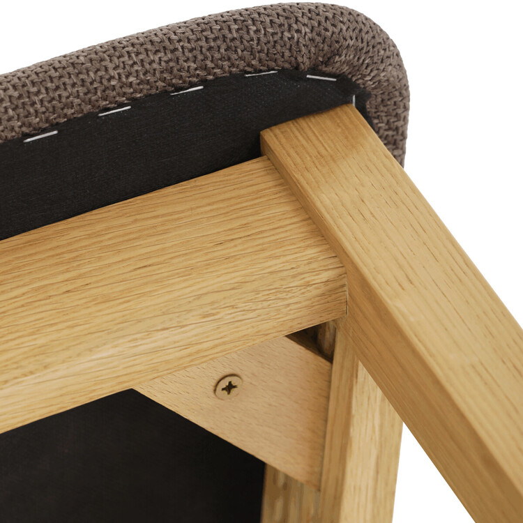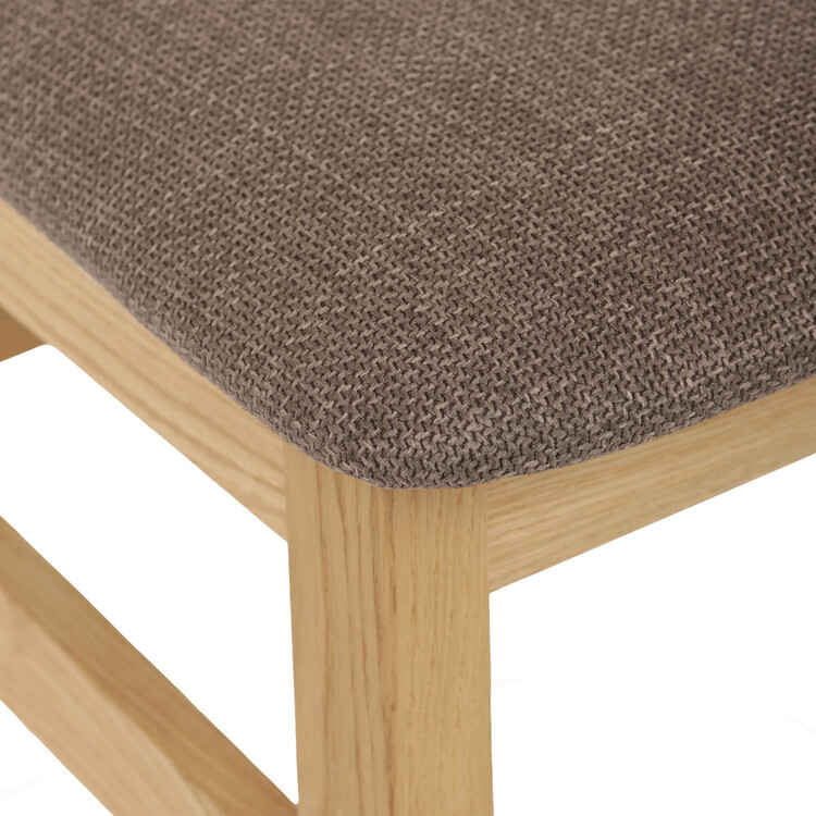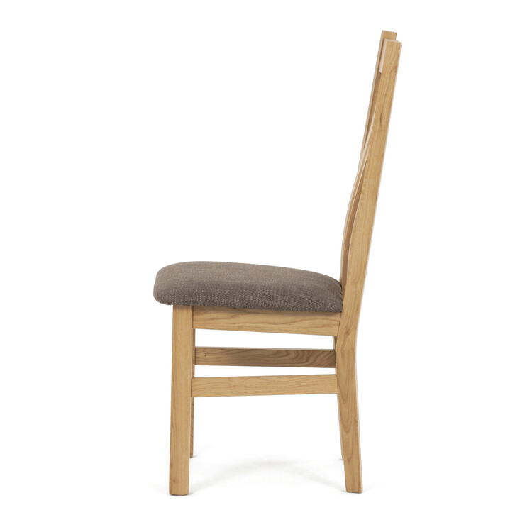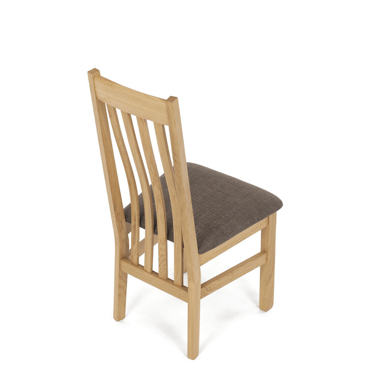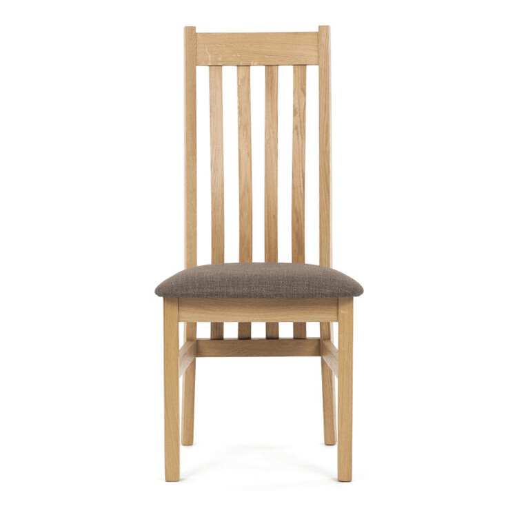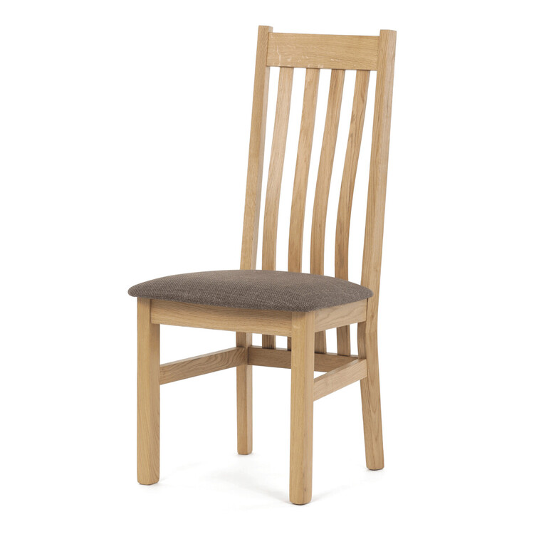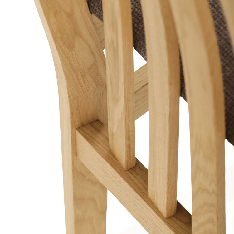 Jídelní židle z masivního dubu nabízí pevnou a stabilní konstrukci, která je navržena pro dlouhodobé používání. Vysoce ergonomicky tvarovaný opěrák svislých lamel poskytuje pohodlnou oporu zad a přispívá k lepšímu držení těla při sezení. Sedák je čalouněný hnědou látkou, která zajišťuje příjemný komfort a snadnou údržbu. Židle nemá područky ani otočný mechanismus, což ji činí vhodnou pro různé typy jídelních prostor. Přírodní odstíny dubového dřeva podtrhují tradiční i moderní styl interiéru.