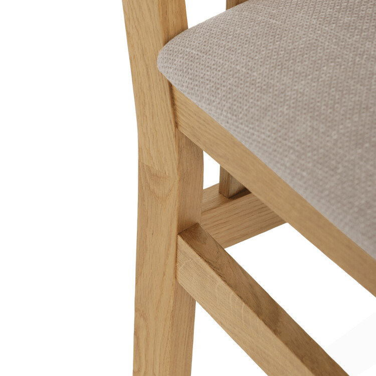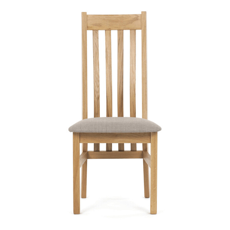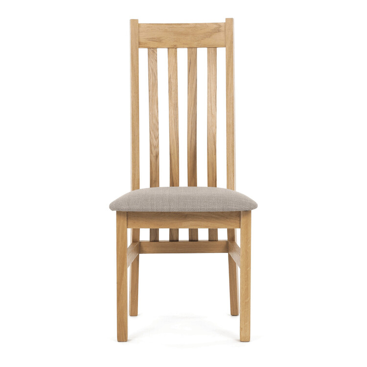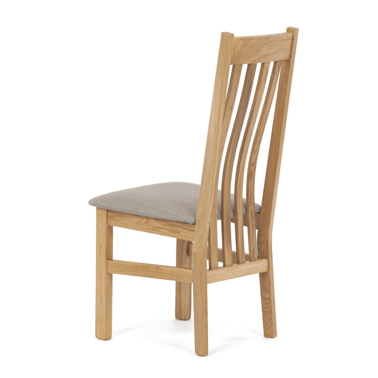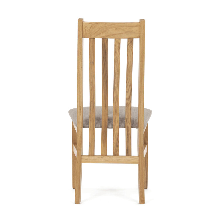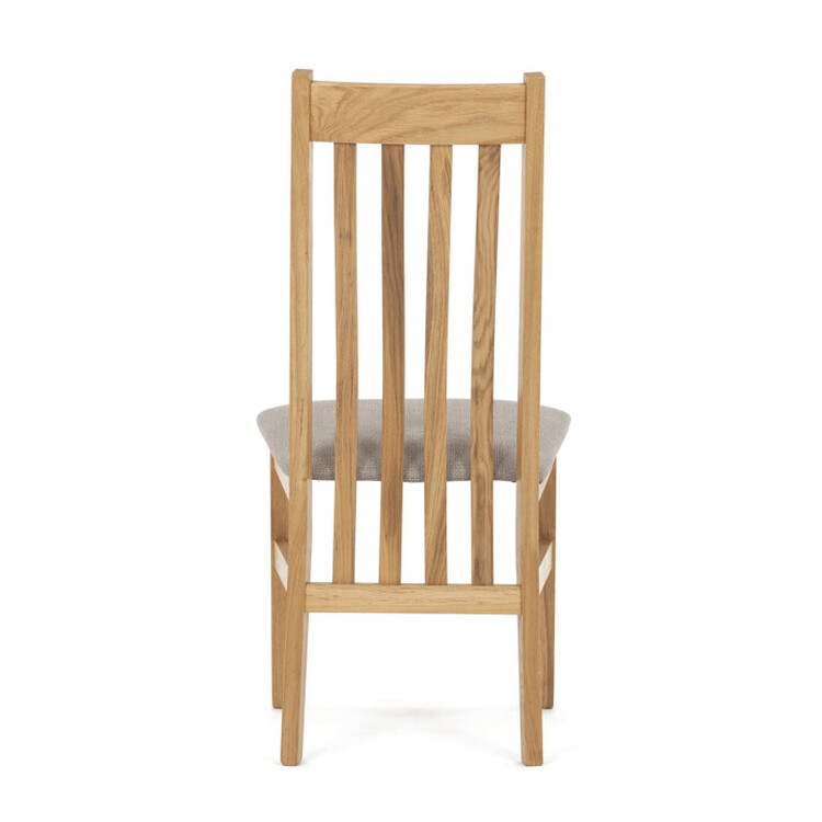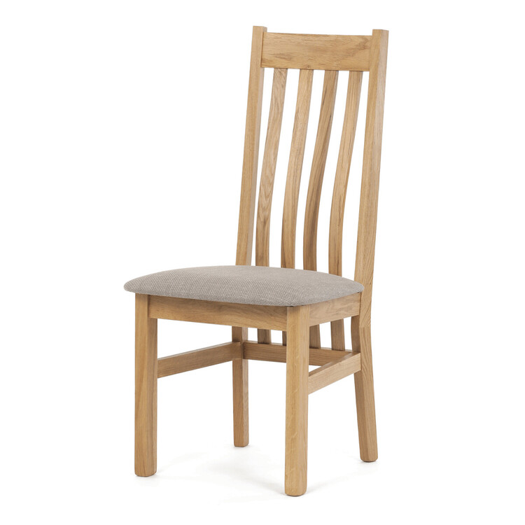 Jídelní židle s označením C-2100 CRM2 je vyrobena z masivního dubového dřeva, které zajišťuje pevnost a dlouhou životnost. Vysoký opěrák je ergonomicky tvarovaný pro pohodlnou oporu zad během sezení, zatímco sedák je čalouněný béžovou látkou příjemnou na dotek. Masivní konstrukce nohou a rámu garantuje stabilitu a odolnost při každodenním používání. Židle nemá područky ani otočný mechanismus, což ji činí ideální volbou pro jídelní prostory s klasickým designem. Přírodní odstíny dřeva v kombinaci s neutrálním potahem umožňují snadné začlenění do různých interiérů.