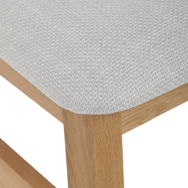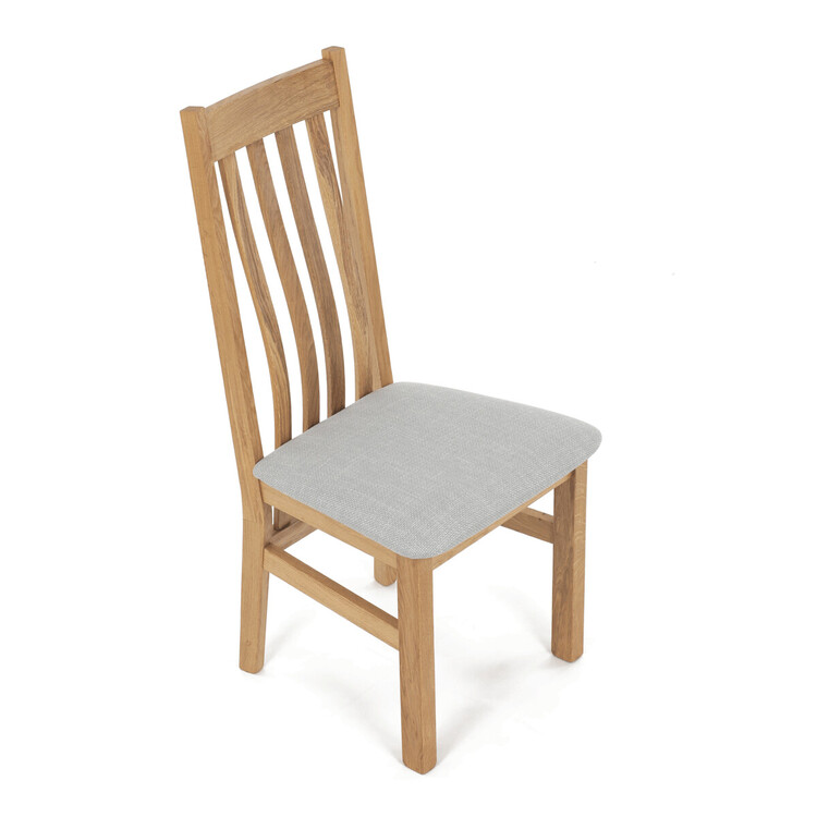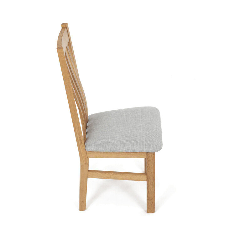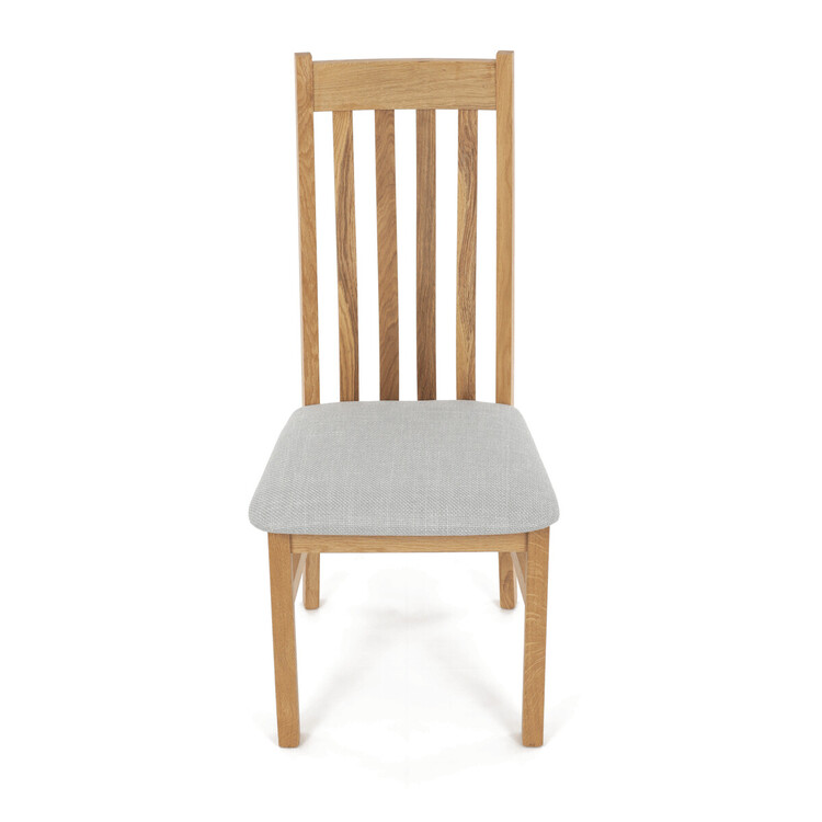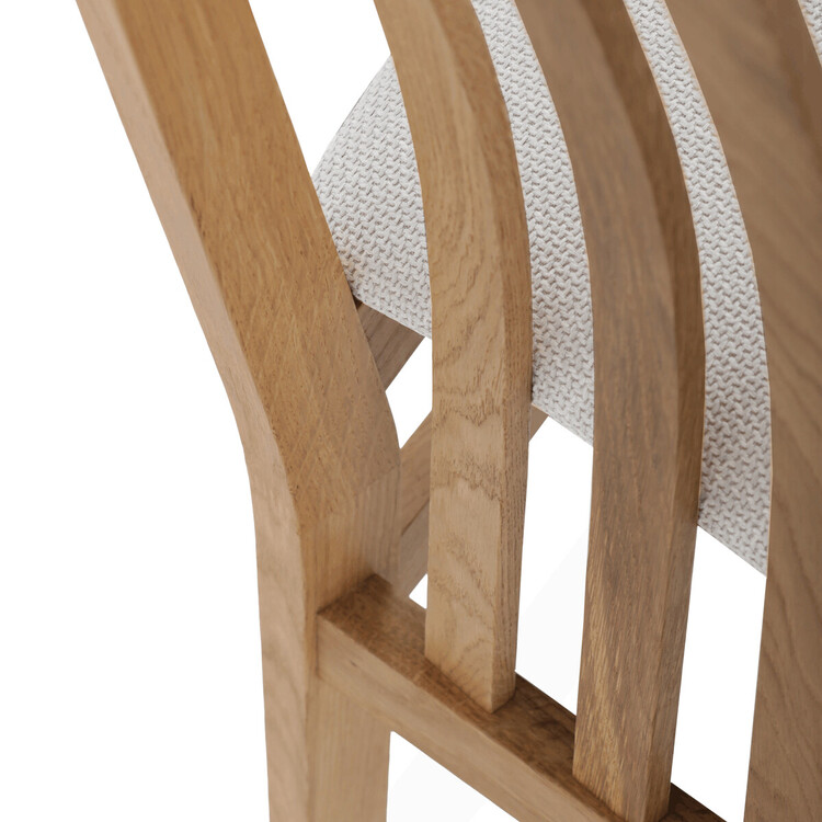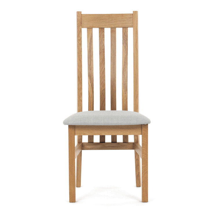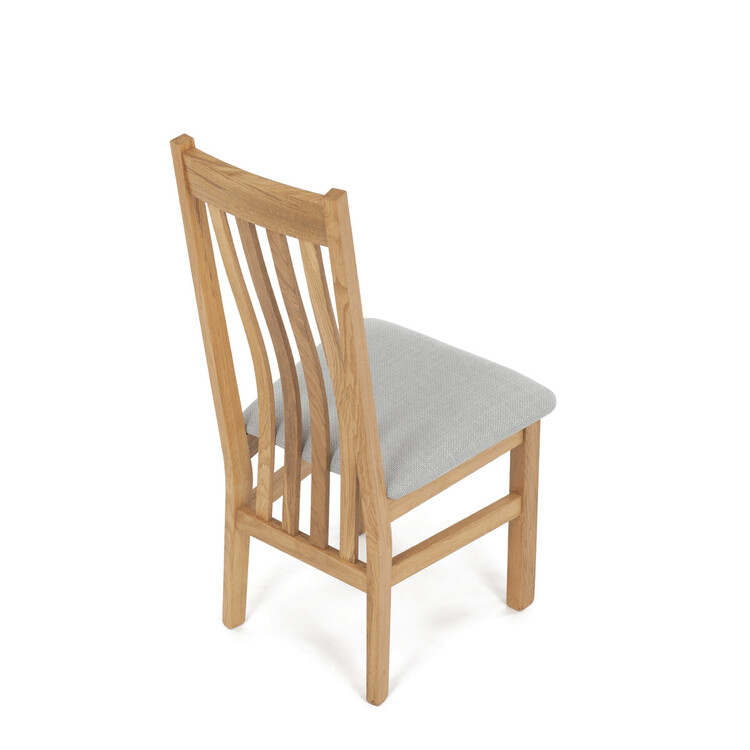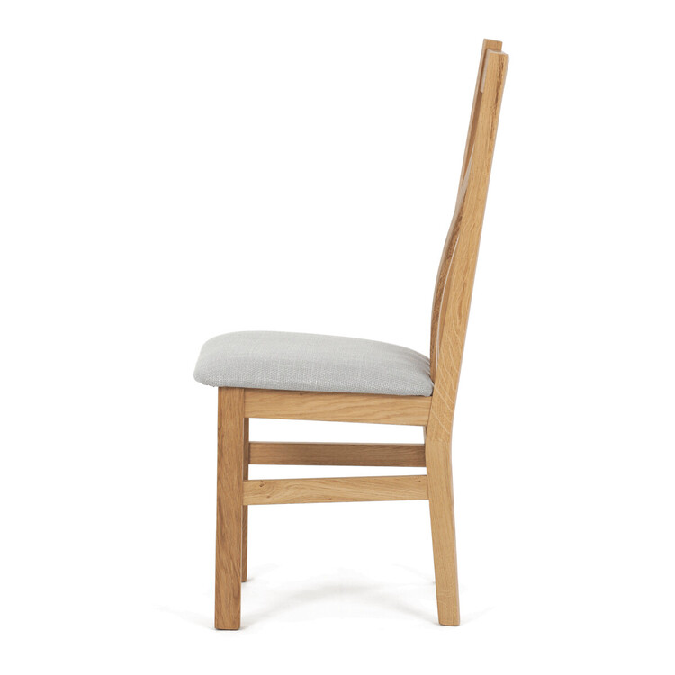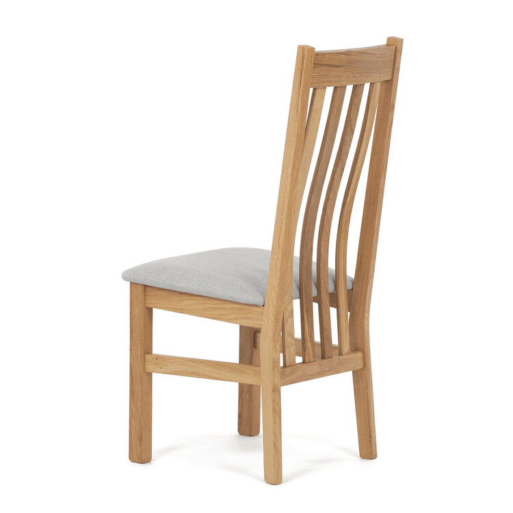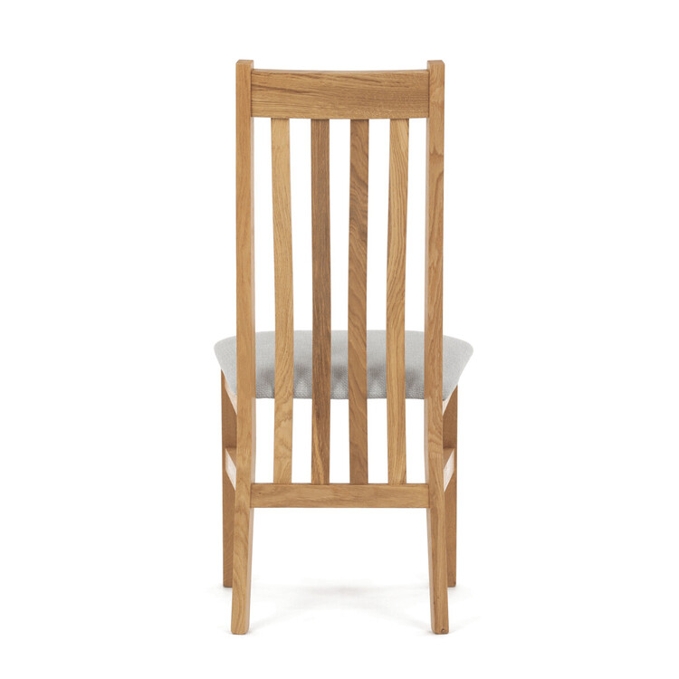 Jídelní židle s označením C-2100 SIL2 je vyrobena z masivního dubového dřeva, které zajišťuje pevnost a stabilitu. Světlé přírodní odstíny dřeva doplňuje sedák potažený světle šedou látkou, která nabízí příjemný komfort při sezení. Židle disponuje ergonomicky tvarovaným vysokým opěrákem s vertikálními dřevěnými lamelami, které podporují správné držení těla během stolování. Masivní nohy jsou pevně spojeny vodorovnými výztuhami, což zvyšuje celkovou odolnost a nosnost židle. Díky jednoduchému a nadčasovému designu je vhodná do různých typů interiérů, kde kladou důraz na kvalitu a přírodní materiály.