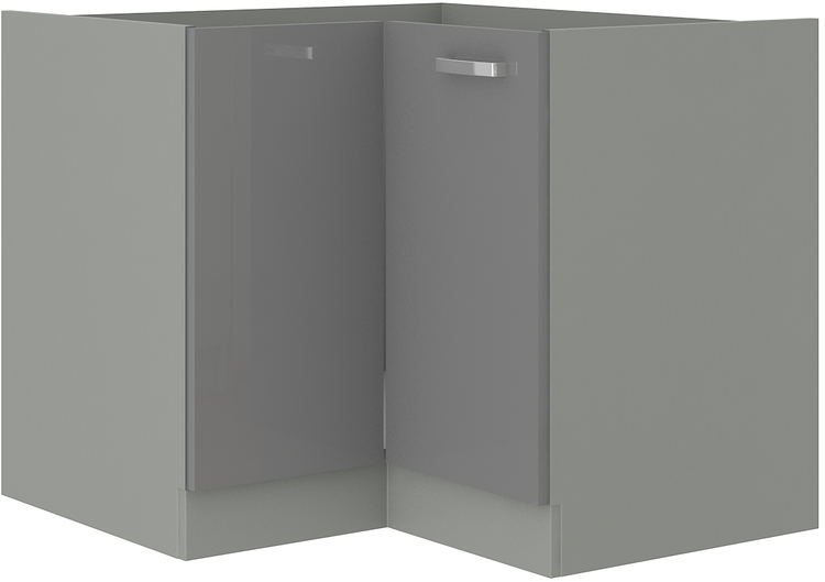 Dolní skříňka rohová GREY vyrobená z kvalitního lamina a MDF. Korpus i sokl ( 10 cm ) jsou v barvě šedá a dvířka v barvě grey šedá v lesku. Rozměry skříňky – šířka 83 × 83 cm, výška 82 cm, hloubka 52 cm. Pracovní deska není v ceně. Úchyty jsou z kovu. Dvířka mají levé otvírání. V naší nabídce naleznete další výběr skříněk k sestavení celé kuchyně.CASA 87001