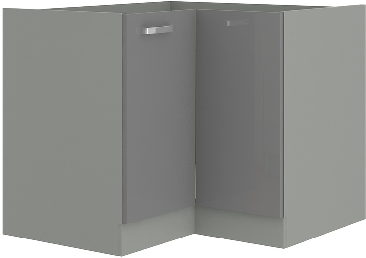 Dolní skříňka rohová GREY vyrobená z kvalitního lamina a MDF. Korpus i sokl ( 10 cm ) jsou v barvě šedá a dvířka v barvě grey šedá v lesku. Rozměry skříňky – šířka 83 × 83 cm, výška 82 cm, hloubka 52 cm. Pracovní deska není v ceně. Úchyty jsou z kovu. Dvířka mají pravé otvírání. V naší nabídce... více informací o zboží