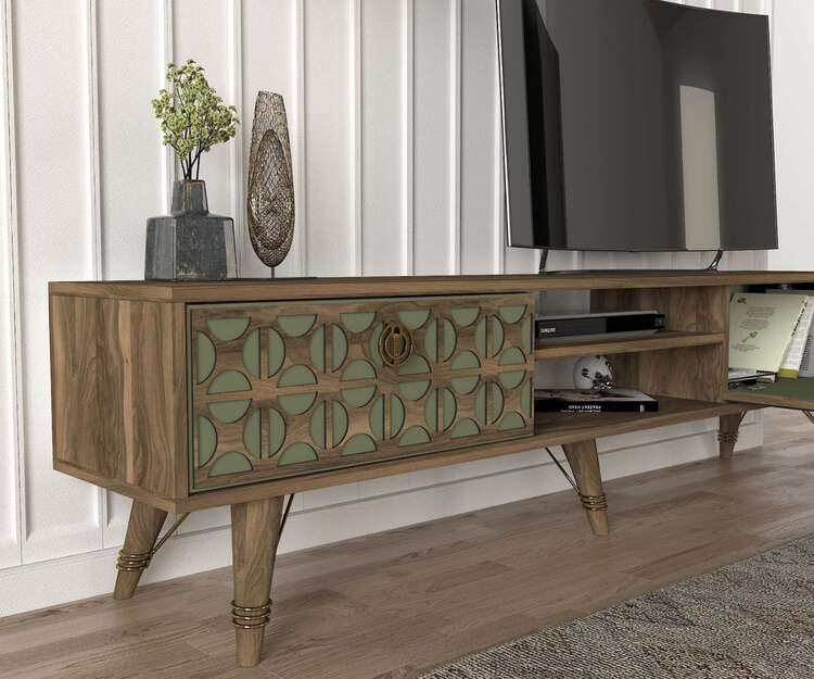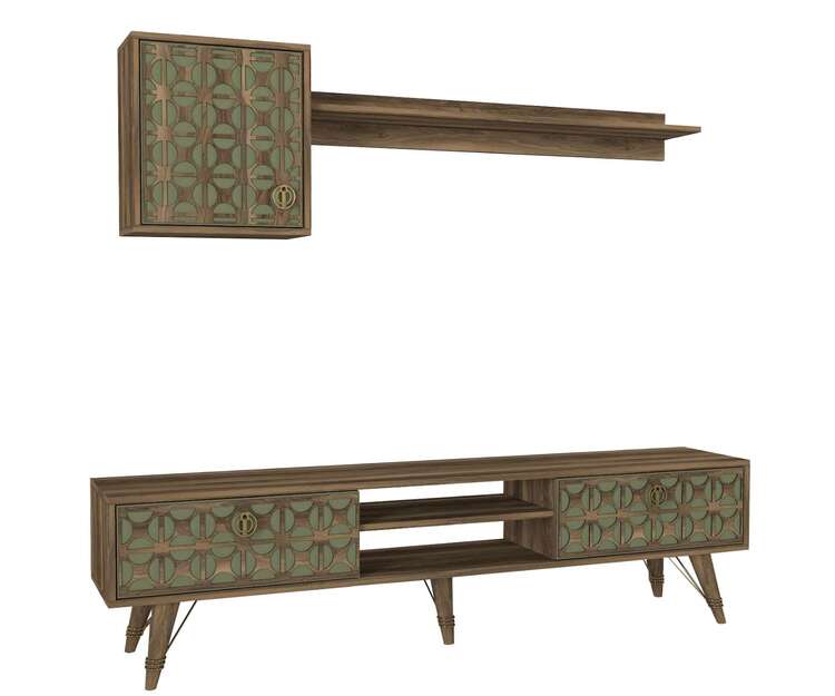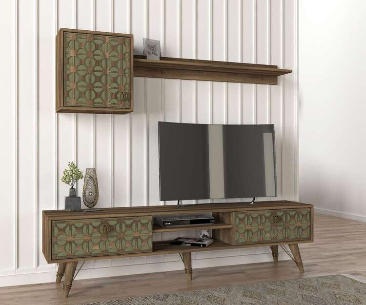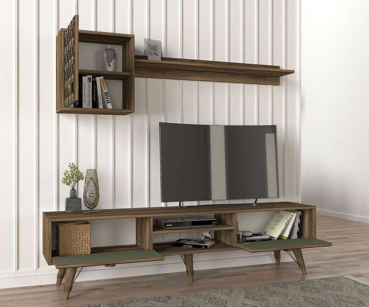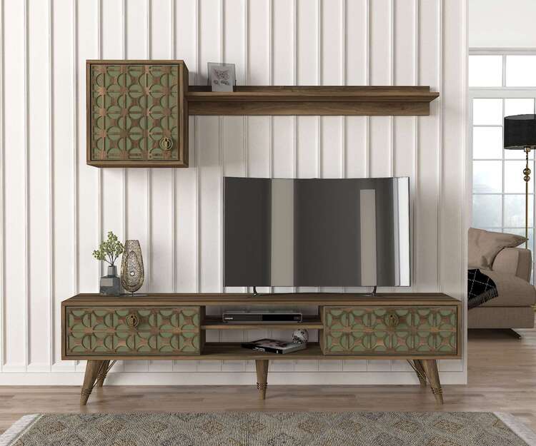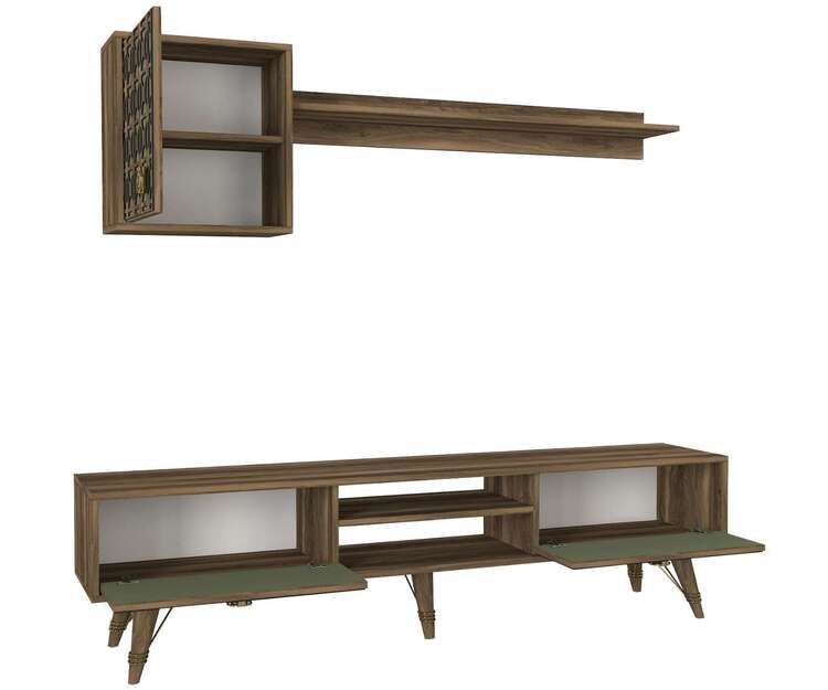 Představujeme obývací stěnu, která v sobě spojuje orientální styl s moderním designem. Tato sestava, charakteristická svou kombinací ořechové a zelené barvy, přináší do vašeho obývacího pokoje teplý a zároveň svěží vzhled.