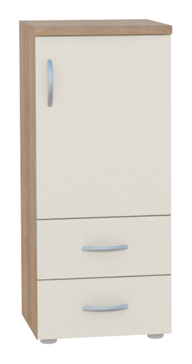 Skříňka na nožkách s dvířky, nastavitelnou policí a dvěma šuplíky ve spodní části skříňky. Možnost výběru barvy a úchytek viz vzorník. Barvy je možné vzájemně kombinovat dle Vašich představ, požadavek na kombinaci barev je nutné uvést do poznámky v objednávce. Možnost výběru levého nebo pravého provedení. Skříňka je zobrazena v pravém provedení. Skříňka má další rozměrové varianty viz varianty zboží. Dodáváno ve smontovaném stavu. Zakázková výroba.