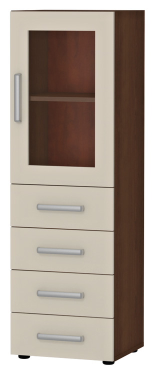 Skříňka na nožkách s prosklenými dvířky, nastavitelnou policí a šuplíky. Možnost výběru barvy, rámu, úchytek a skla viz vzorník. Barvy je možné vzájemně kombinovat dle Vašich představ, požadavek na kombinaci barev je nutné uvést do poznámky v objednávce. Možnost výběru levého nebo pravého provedení. Skříňka je zobrazena v pravém provedení. Skříňka má další rozměrové varianty viz varianty zboží. Dodáváno ve smontovaném stavu. Zakázková výroba.
