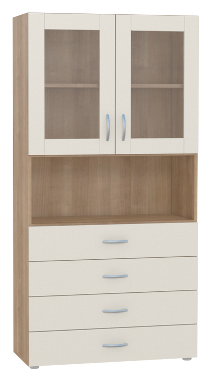 Skříňka na nožkách s prosklenými dvířky, nastavitelnou policí, nikou a šuplíky. Možnost výběru barvy, rámu, úchytek a skla viz vzorník. Barvy je možné vzájemně kombinovat dle Vašich představ, požadavek na kombinaci barev je nutné uvést do poznámky v objednávce. Skříňka má další rozměrové varianty viz varianty zboží. Dodáváno ve smontovaném stavu. Zakázková výroba.