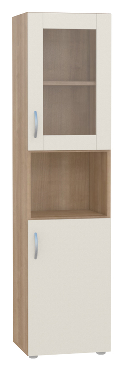 Skříňka na nožkách s dvířky, prosklenými dvířky a nastavitelnou policí. Možnost výběru barvy, rámu, úchytek a skla viz vzorník. Barvy je možné vzájemně kombinovat dle Vašich představ, požadavek na kombinaci barev je nutné uvést do poznámky v objednávce. Možnost výběru levého nebo pravého provedení. Skříňka je zobrazena v pravém provedení. Skříňka má další rozměrové varianty viz varianty zboží. Dodáváno ve smontovaném stavu. Zakázková výroba.