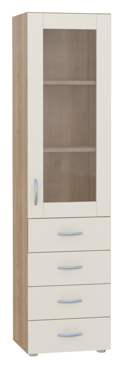 Skříňka na nožkách s prosklenými dvířky, nastavitelnou policí a šuplíky. Možnost výběru barvy, rámu, úchytek a skla viz vzorník. Barvy je možné vzájemně kombinovat dle Vašich představ, požadavek na kombinaci barev je nutné uvést do poznámky v objednávce. Možnost výběru levého nebo pravého provedení. Skříňka je zobrazena v pravém provedení. Skříňka má další rozměrové varianty viz varianty zboží. Dodáváno ve smontovaném stavu. Zakázková výroba.