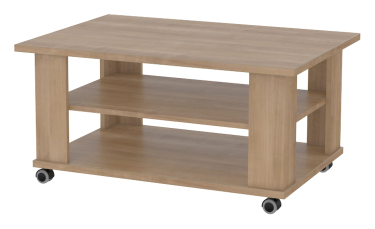 Konferenční stolek na kolečkách a policí. Stolová deska je s přesahem. Možnost výběru barvy viz vzorník. Stolek má další rozměrové varianty. Dodáváno ve smontovaném stavu. Zakázková výroba.